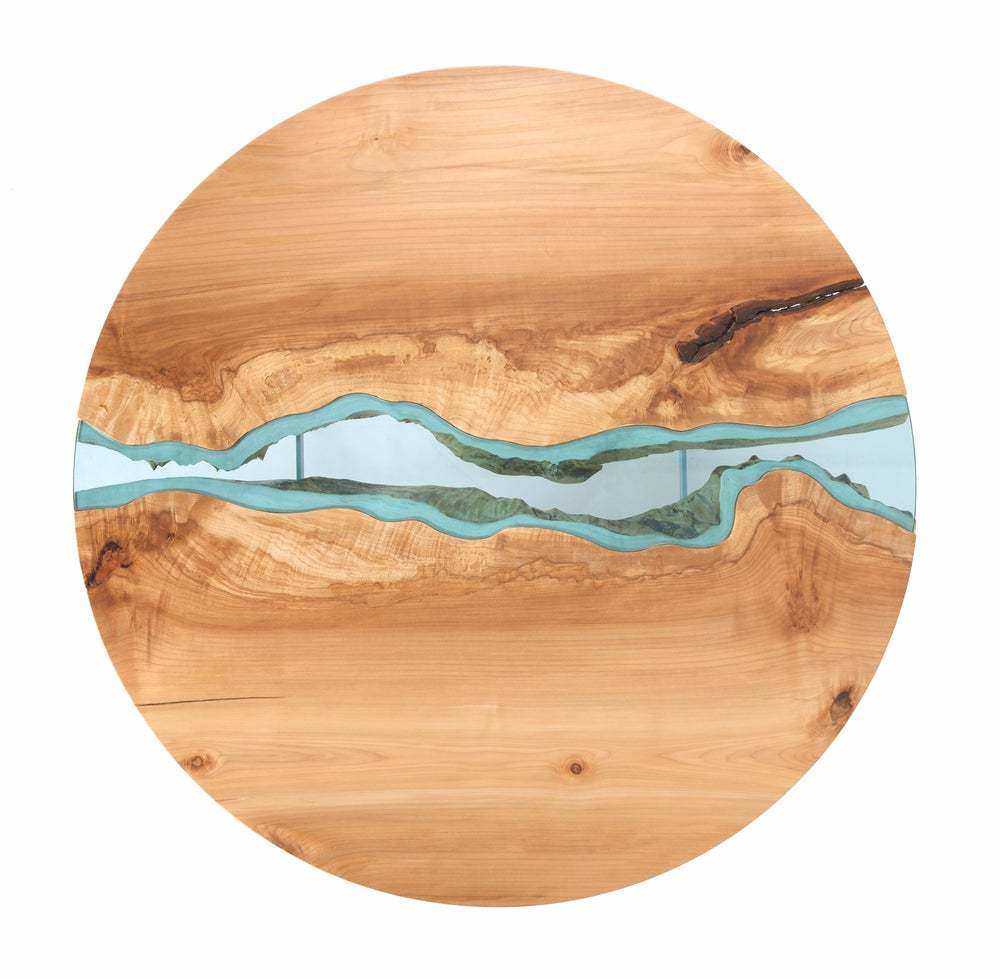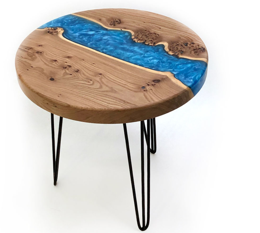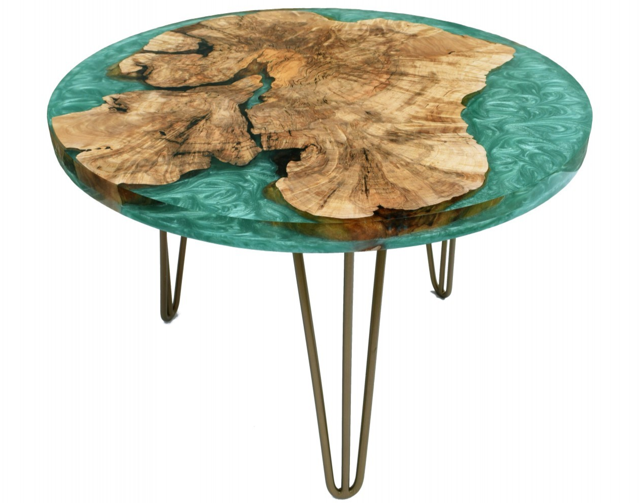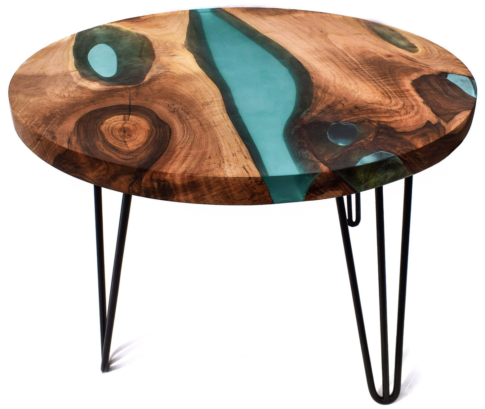 Журнальный стол из слэба карагача с заливкой из голубой эпоксидной смолы. Металлическое подстолье черного цвета. Размер подбирается индивидуально под ваши параметры.