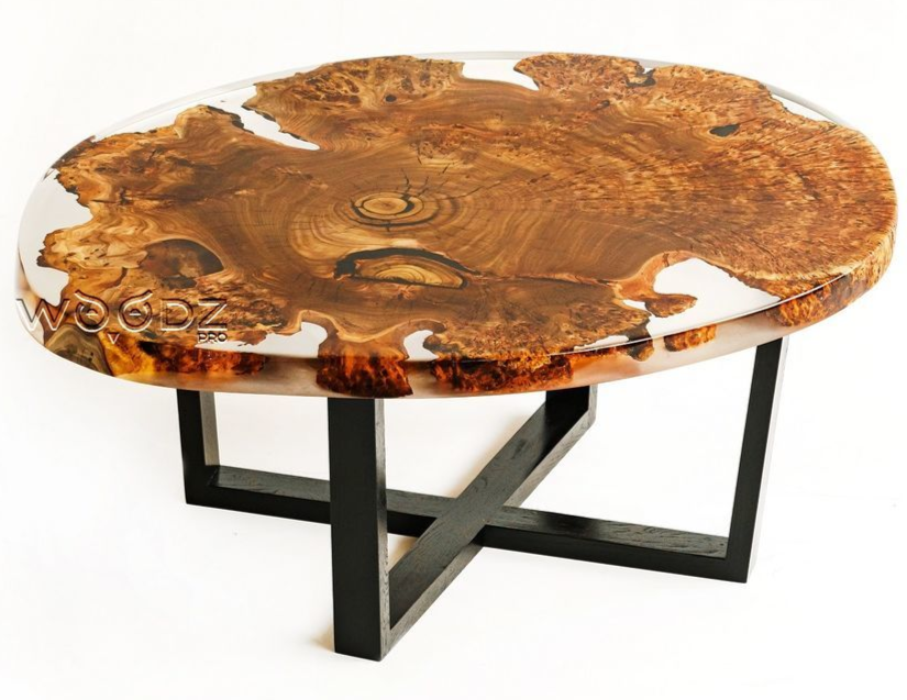 Журнальный стол из слэба тополя с заливкой из прозрачной эпоксидной смолы. Металлическое подстолье черного цвета. Размер подбирается индивидуально под ваши параметры.